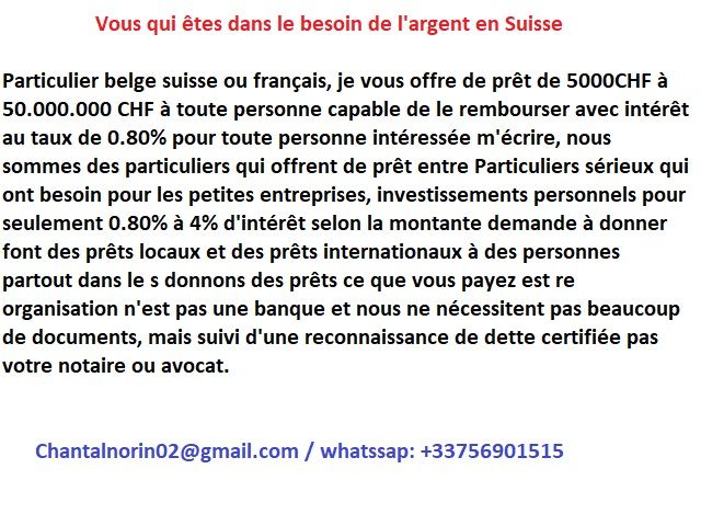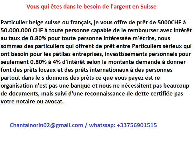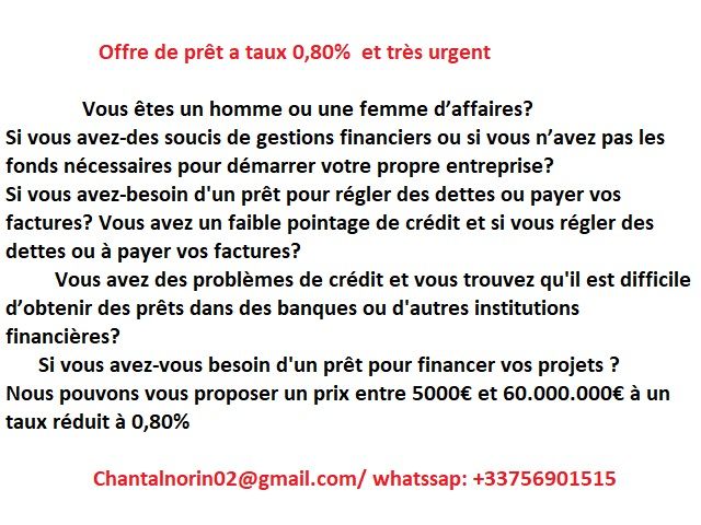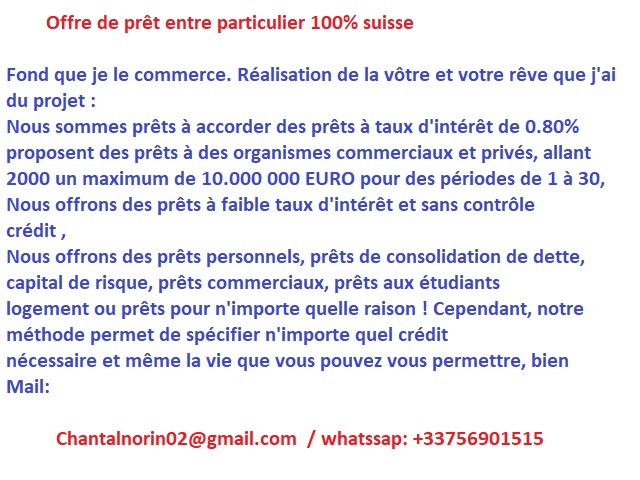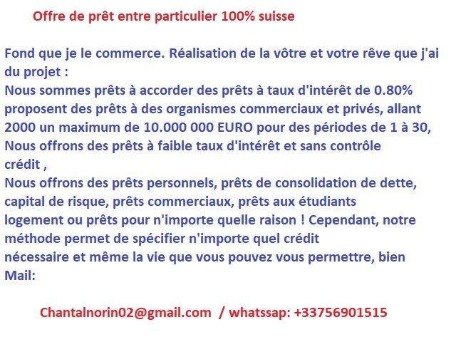 Service de Financement de prêt - investissement - FINANCEMENT DE PRËT ET INVERTISEMENT Pour la nouvelle année bénéficier de notre service de prêt et de financement - investissement pour reprendre vos activités dans les bonnes conditions PRÊT ET INVESTISSEMENT DE L'ARGENT POUR VOS PROJETS Nous sommes des particuliers qui offrent de prêt entre Particuliers sérieux qui ont besoin pour les petites entreprises, investissements personnels pour seulement 0.80 % à 4 % d'intérêt selon la montante demande, avec des simples mutations qui nécessitent pas beaucoup de documents, mais suivi d'une reconnaissance de dette certifiée pas votre notaire ou avocat. Juste et honnête et fiable. Contactez-nous dès aujourd'hui pour votre demande de financement ou d'investissement. Voulez le prêt rapide sans aucun souci de faux frais avec nous tous les documents sont enregistré par l'avocat de notre compagnie et tout est bien clair, pour la nouvelle année bénéficier de notre service financier pour reprendre vos activités dans les meilleures conditions avec les meilleures réalisations et les meilleurs vœux 2025. Le financement pour de prêts crédits particulier est de 10.000 € à 10.000.000€ à un taux réduit de 0.80 % à 4 % L'investissement est de 10 millions d'euros à 30 Milliard d'euros tout sera signé face à face sur un rendez-vous Nos clients sont servis dans les 48 heures suivant la réception de votre demande. Chantalnorin02@gmail.com / whatssap: +33756901515