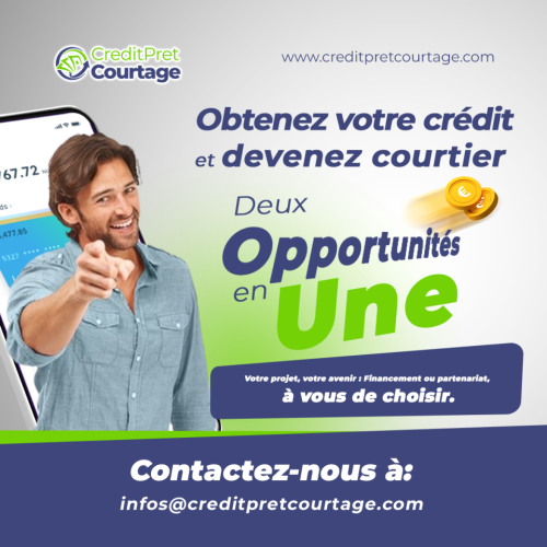 Obtenez rapidement le financement dont vous avez besoin avec CreditPrêtCourtage. Prêts personnels, immobiliers, auto et professionnels, à taux compétitifs et conditions flexibles. Demandez votre prêt en ligne et recevez une réponse rapide. Plus d'infos sur : [www.creditpretcourtage.com](https://www.creditpretcourtage.com/) Offre : https://www.creditpretcourtage.com/fr Demande en ligne : https://www.creditpretcourtage.com/fr/demandedepret