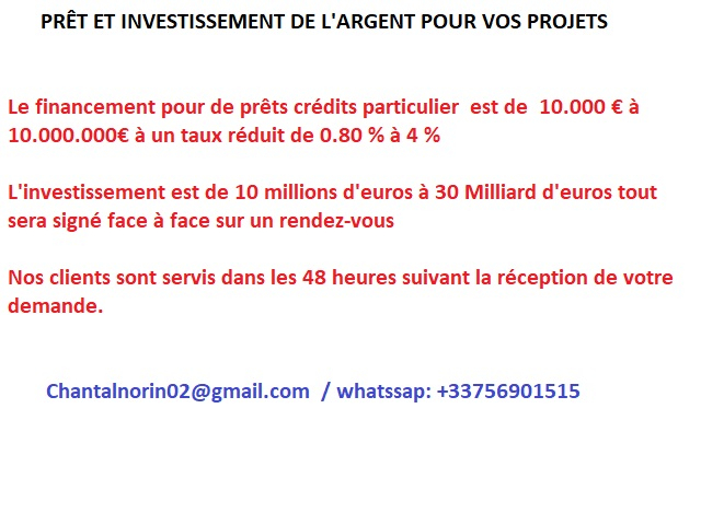 Offre de prêt a taux 0,80% et très urgent Vous êtes un homme ou une femme d’affaires? Si vous avez-des soucis de gestions financiers ou si vous n’avez pas les fonds nécessaires pour démarrer votre propre entreprise? Si vous avez-besoin d'un prêt pour régler des dettes ou payer vos factures? Vous avez un faible pointage de crédit et si vous régler des dettes ou à payer vos factures? Vous avez des problèmes de crédit et vous trouvez qu'il est difficile d’obtenir des prêts dans des banques ou d'autres institutions financières? Si vous avez-vous besoin d'un prêt pour financer vos projets ? Nous pouvons vous proposer un prix entre 5000€ et 60.000.000€ à un taux réduit à 0,80% Ps : Pas sérieux s'abstenir parce que je vérifie tous les documents à la préfecture . chantalnorin02@gmail.com/ whatssap: +33756901515