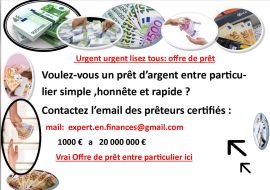 Offre de prêt entre particuliers Très sérieux et rapide en 72 Heures- - je donne des prêts d'argent sérieux mon mail est :( expert.en.finances@gmail.com ) Je donne de 1000€ a 10 000 000€ Bonjour a tous
